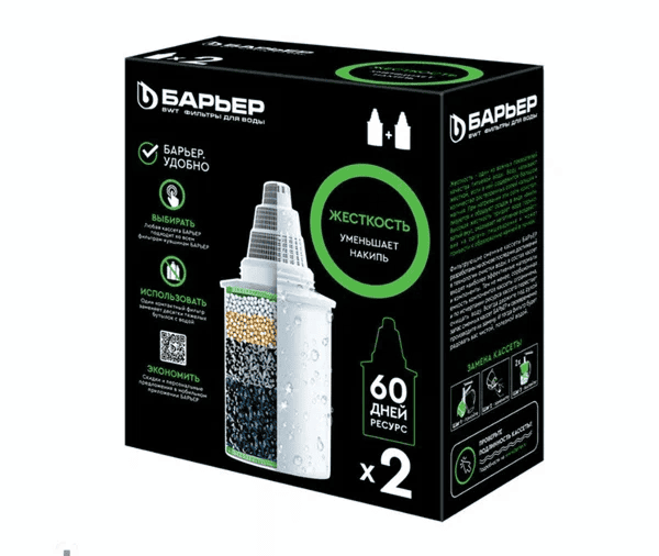 Комплект из двух кассет подходит для всех кувшинов Барьер соответствующего типа и рассчитан на несколько месяцев чистой и мягкой воды в вашем доме.