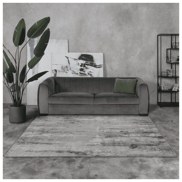 Ковер оформлен в приятной серо-бежевой гамме с абстрактным узором, который делает интерьер более интересным и современным. Мягкий переход оттенков позволяет легко сочетать модель с разной мебелью и напольными покрытиями.