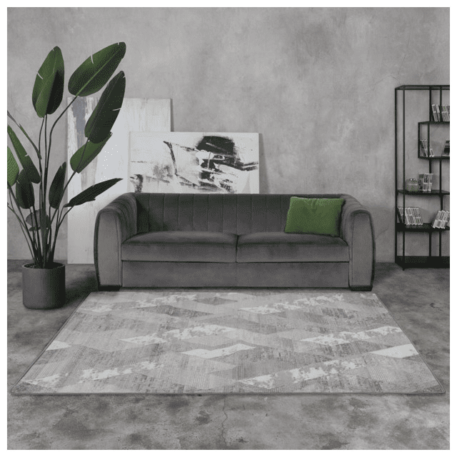 Ковер выполнен в серо-бежевой гамме с геометричным рисунком, который делает интерьер более аккуратным и современным. Мягкие переходы оттенков позволяют легко сочетать модель с разной мебелью и напольными покрытиями.