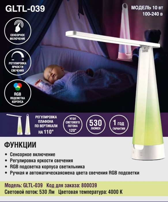 Светильник настольный General GLT-039 c подсветкой RGB белый 10Вт LED