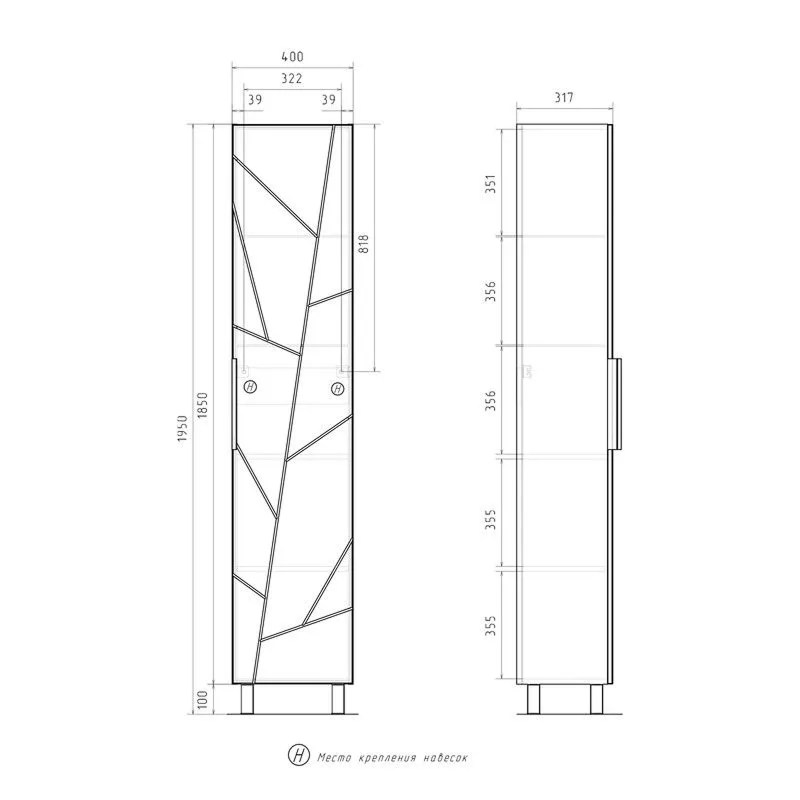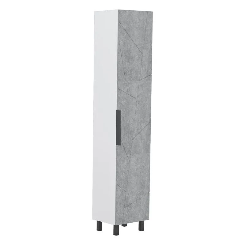 Фасад оформлен под бетон с мягким матовым эффектом и декоративной фрезеровкой, благодаря чему шкаф выглядит выразительно. Внутри предусмотрены стеклянные и ЛДСП-полки — на них удобно размещать косметику, бытовую химию и полотенца. Дверца закрывается мягко и без лишнего шума благодаря встроенному доводчику. Пенал устанавливается на регулируемые ножки, что помогает выставить его ровно даже на неровном полу.