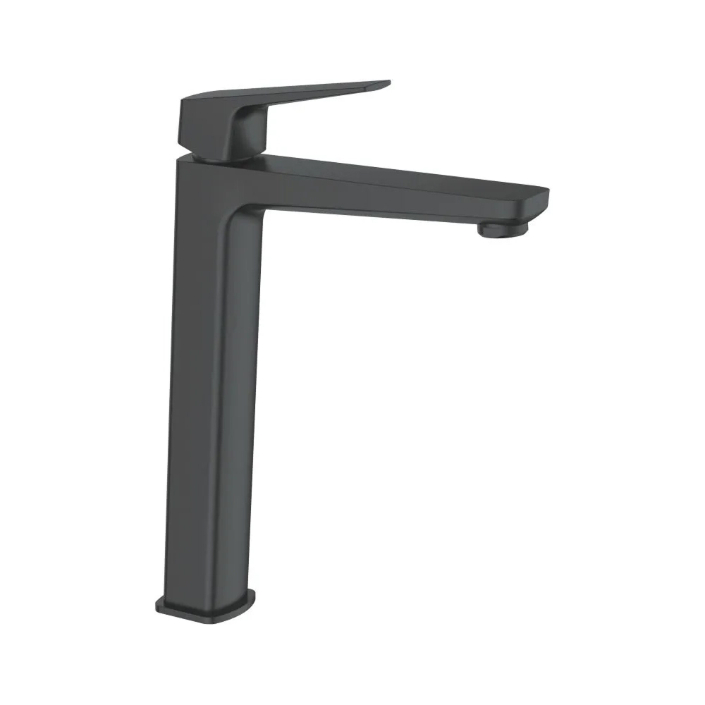 Высокий смеситель для умывальника в матовом чёрном цвете помогает создать в ванной выразительный современный акцент и делает использование раковины заметно удобнее.
