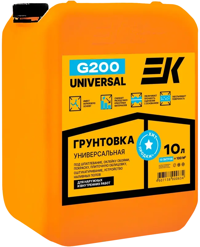 Грунтовка ЕК G200 предназначена для обработки сильновпитывающих оснований (газобетон, пенобетон, силикатный кирпич, шлакобетонные и керамзитобетонные блоки), а также наливных полов и стяжек, цементных и гипсовых штукатурок, шпатлевок, монолитного бетона, ГКЛ, ГВЛ, ЦСП с целью снижения впитывающей способности, связывания остатков пыли, улучшения сцепления материалов, снижения расхода обойного клея и краски. Может использоваться перед нанесением гипсовых и цементных штукатурок, устройством наливных полов и стяжек, плиточной облицовкой, шпатлеванием, оклейкой обоями, покраской.