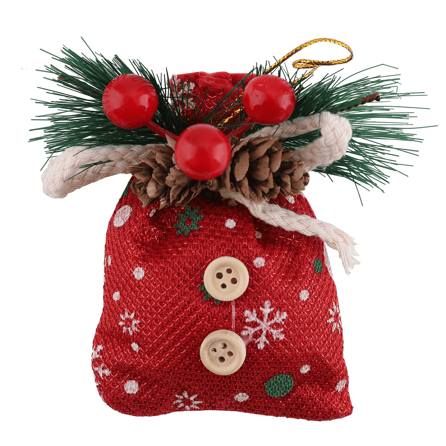 Новогоднее украшение в виде мешочка из красной ткани — стильный элемент для декора ёлки или праздничного интерьера. Изделие украшено шишками, зелёными веточками и красными ягодами, дополнено декоративными пуговицами.